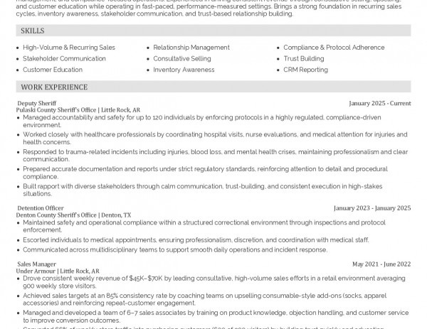 Performance driven professional with experience across sales and law enforcement, transitioning into medical sales. While earning a Psychology degree in 2022, I developed B2B sales experience at LA Fitness and later led high performing teams as a Sales Manager at Under Armour before serving four years as a Deputy Sheriff. Law enforcement strengthened my ability to operate under pressure, make critical decisions, and build trust in high-stakes environments. I bring discipline, resilience, and accountability to results-driven settings, with a focus on supporting providers and improving patient outcomes.